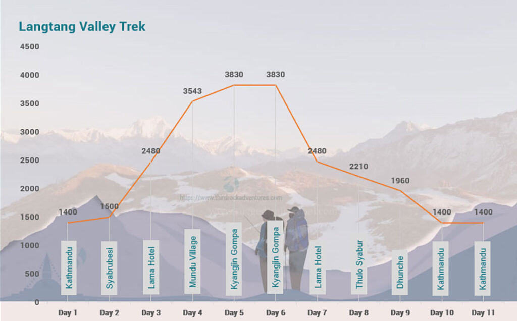 Langtang Valley Trek involves walking under the foothills of the Langtang Range, which is made up of several 7,000 and 6,000-meter peaks. The highest point of your trek is Tserko Ri (4,984m). Altitude sickness won’t be much of an issue as you will be walking and spending your nights at elevations less than 4,000 meters. But it’s always better to take precautions and follow safety measures to ensure you have a safe trip in the mountains.